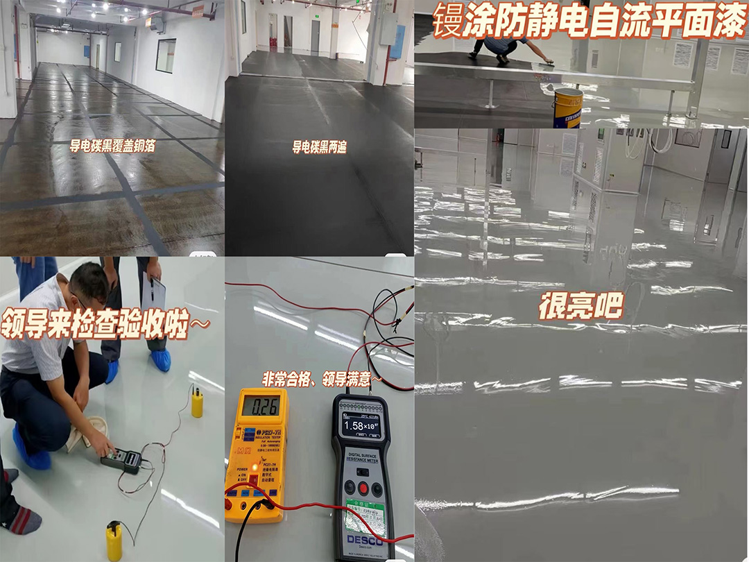 6. 防静电面漆施工:采用环氧防静电自流平面漆,均匀镘涂施工,厚度控制在1.0mm~3.0mm,表面无气泡、无刀痕、色泽一致。