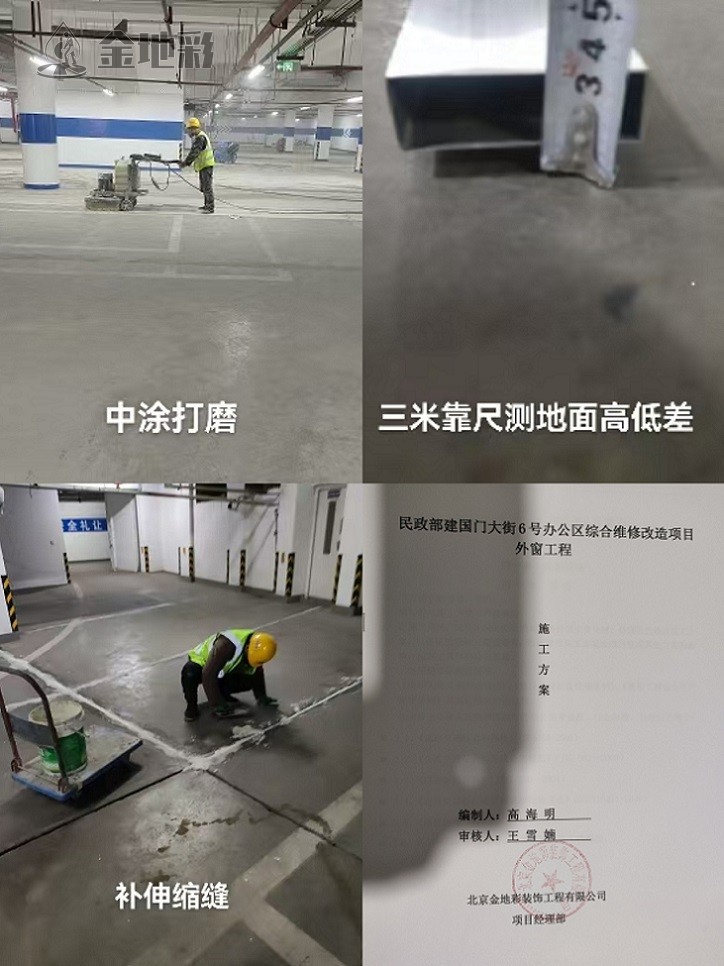 施工伊始,我们便深刻认识到该项目的特殊性。地下车库作为民政部日常通勤、车辆停放的核心区域,地坪漆不仅要具备美观整洁的视觉效果,更要兼顾耐磨、抗压、防滑、易清洁等实用性能,同时要契合机关单位严谨、规范、庄重的整体调性。为此,我们团队提前深入勘察现场,全面排查地面基层状况,针对车库地面存在的细微裂缝、凹凸不平、油污残留等问题,制定了详尽的专项处理方案。从基层打磨、除尘清洁,到裂缝修补、腻子找平,每一道前置工序都一丝不苟,只为给后续地坪漆施工筑牢坚实基础,杜绝因基层处理不到位引发的起皮、空鼓、开裂等质量隐患。