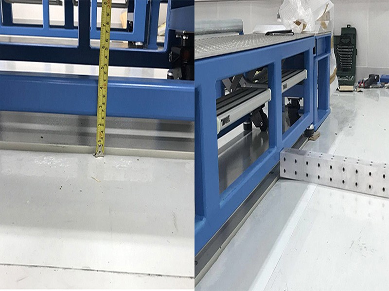 北京奔驰实验室约11.5*8m, 室内装了两个设备。设备地板是大钢板镶嵌在地表(见下图),钢板与地面有2-10mm 宽,深约30mm的缝隙。钢板略高于地面行成了台阶,需要做找平处理后刷地坪漆。