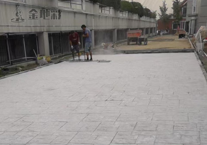 3.脱模粉施工:压印前均匀撒布专用脱模粉,有效防止模具与地面粘连,保障小方块纹理完整清晰,便于后续脱模作业