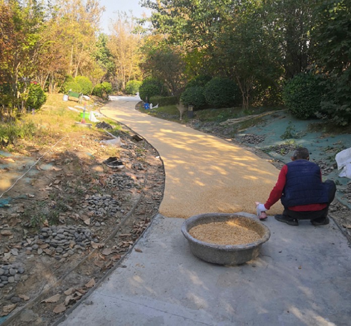 本案以柔和雅致的米黄色系为主调,采用高性能环保胶粘剂与天然彩石复合工艺,不仅实现了路面的高效透水与防滑,更通过精准的配色与施工,营造出与周边自然环境高度融合的视觉体验。本项目已成为行业内米黄色胶粘石施工的标准化示范工程,为广大客户提供了可复制、可落地的高品质景观地坪解决方案。