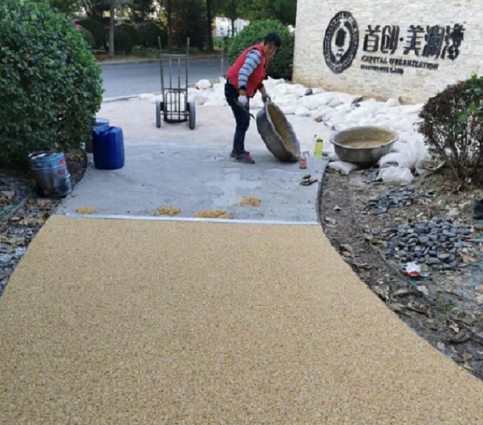 1、彩石胶粘剂现场拌和,需要把金地彩聚酯胶与固化剂勾兑,拌和均匀后倒入到洁净的石子行进行人工掺和、拌和、倒两遍,使石子、胶充沛融和再铺装!